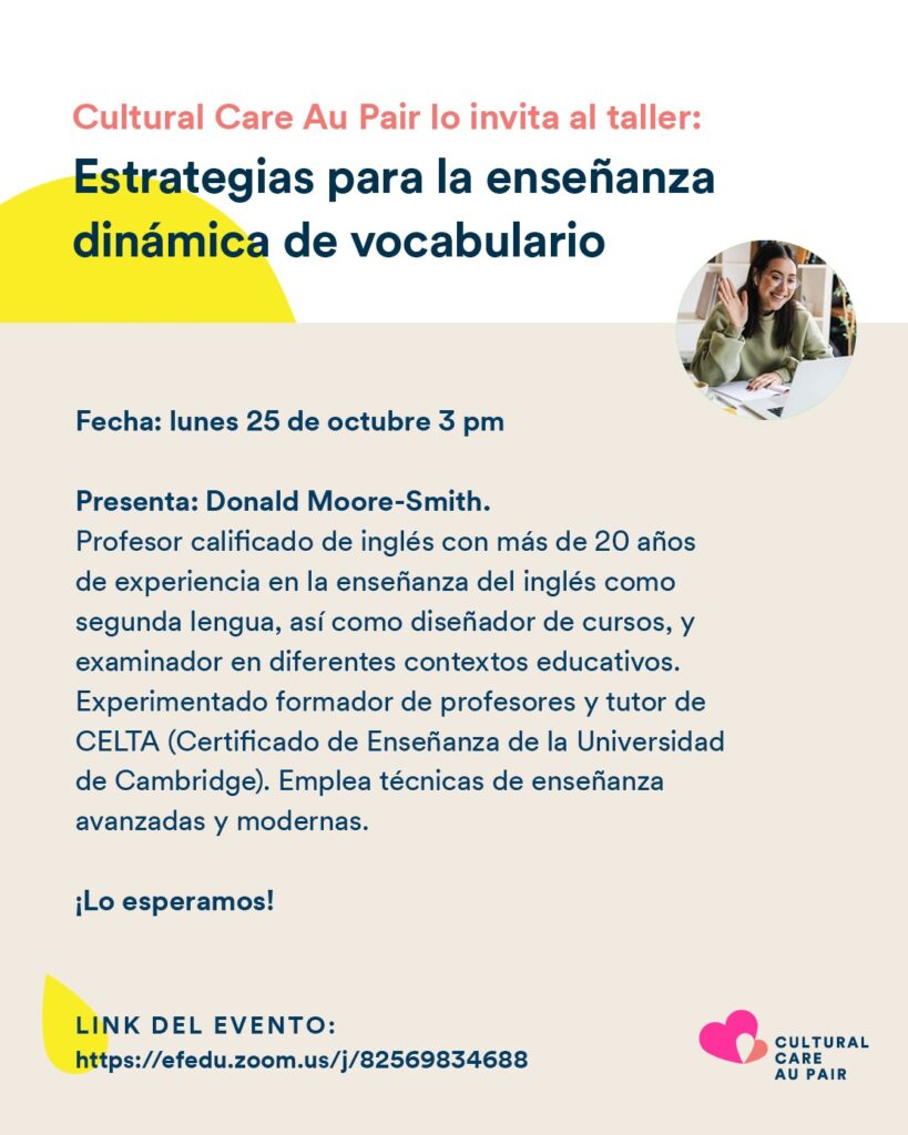 La Oficina de Relaciones Interinstitucionales ORI extiende la invitación Cultural de Care Au Pair a toda la comunidad universitaria al próximo taller en línea: ¨Estrategias para la enseñanza dinámica de vocabulario¨, el cual, estará a cargo de Donald Moore-Smith, profesor calificado de inglés con más de 20 años de experiencia en la enseñanza del inglés como segunda lengua, así como diseñador de cursos, y examinador en diferentes contextos educativos.