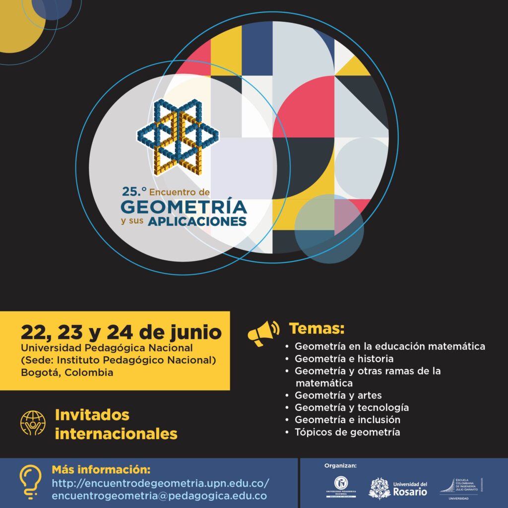 La Universidad Pedagógica Nacional, la Escuela Colombiana de Ingeniería Julio Garavito y la Universidad del Rosario invitan a la comunidad académica a participar del 25. ° Encuentro de Geometría y sus Aplicaciones. El evento se realizará entre el 22 y el 24 de junio de 2022 en modalidad presencial, en el Instituto Pedagógico Nacional (Bogotá, Colombia).