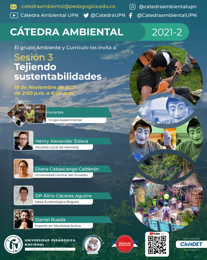 La Universidad Pedagógica Nacional y el grupo Ambiente y Currículo los invita a participar este 19 de noviembre de la tercera sesión de la Cátedra Ambiental «Maestros Constructores de una Colombia sustentable y en Paz», en esta sesión conversaremos bajo la premisa «Tejiendo sustentabilidades: Desde el diálogo territorial» y reconoceremos experiencias nacionales e internacionales, visibilizando el aporte de actores importantes para el cuidado de los territorios y la protección de la madre Tierra.