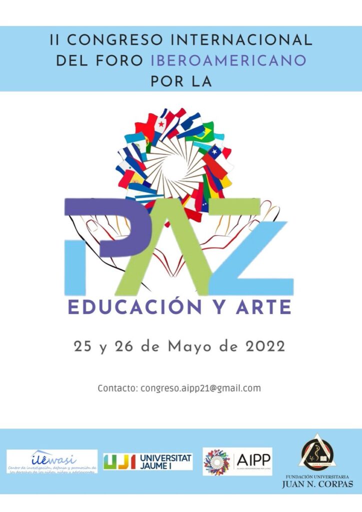 El Foro Iberoamericano por la Paz, a través de la Alianza Iberoamericana por la Paz, en coordinación con la Fundación Universitaria Juan N. Corpas, Bogotá Colombia, y con ILÊWASI- Centro de investigación, defensa y promoción de los derechos de los niños, niñas y adolescentes, Castellón de la Plana España, convocan al II Congreso del Foro Iberoamericano por la Paz “Educación y Arte”, que tendrá lugar del 25 y 26 de mayo de 2022, en modalidad virtual. Para 2022, el Congreso aporta una mirada desde la educación y el arte en la construcción de una cultura de paz.