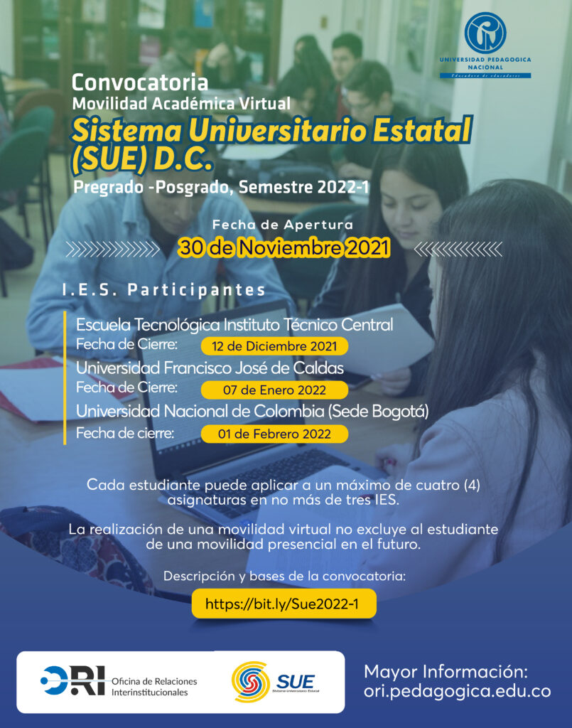 La Oficina de Relaciones Interinstitucionales de la Universidad Pedagógica Nacional de Colombia (ORI-UPN), se complace en abrir la Convocatoria de Movilidad Académica Estudiantil para el periodo 2022 -1 del Sistema Universitario Estatal – SUE.