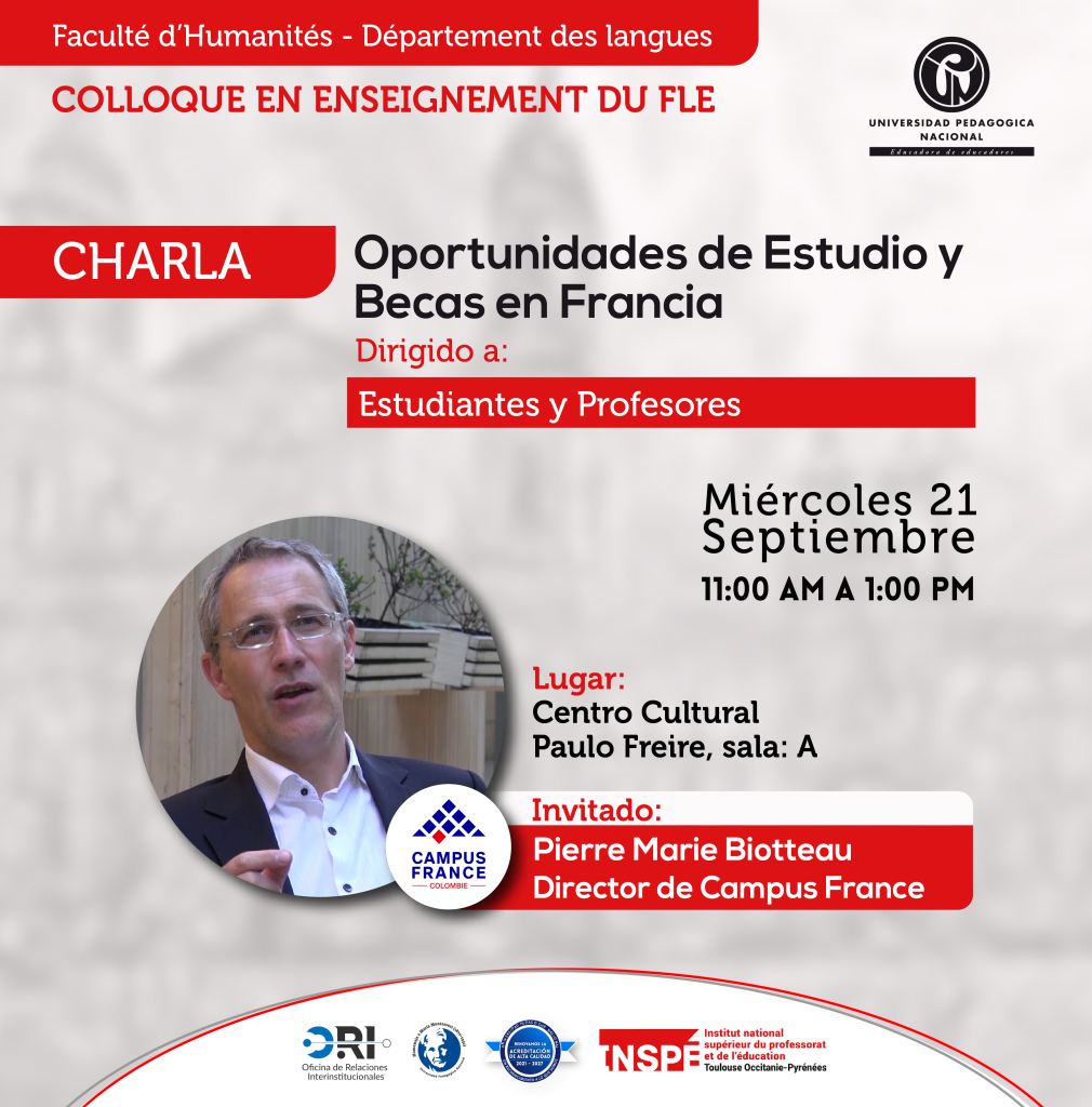 La Facultad de Humanidades, el Departamento de Lenguas y la Oficina de Relaciones Interinstitucionales – ORI, invita a la comunidad académica a participar en la charla: Oportunidades de Estudio y Becas en Francia, orientada por el director de Campus France: Pierre Marie Biotteau que se desarrollará el 21 de septiembre en el centro cultural Paulo Freire, sala A, de 11:00 am a 1:00 pm, en el marco del COLLOQUE EN ENSEIGNEMENT DU FLE 2022.