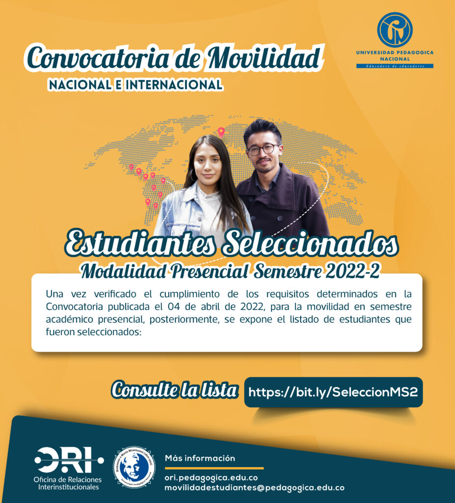 Una vez verificado el cumplimiento de los requisitos determinados en la Convocatoria publicada el 04 de abril de 2022, para la movilidad en semestre académico presencial, posteriormente, se expone el listado de estudiantes que fueron seleccionados: