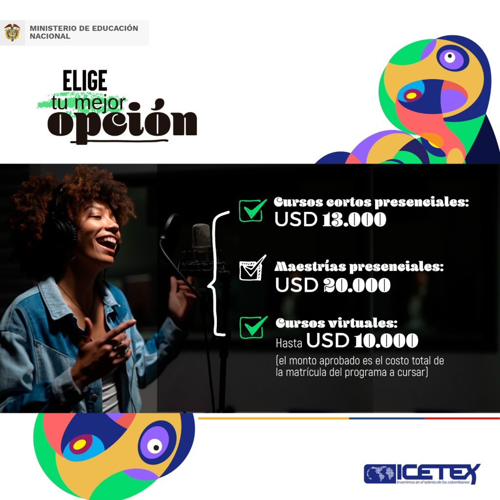 El ICETEX, con el ánimo de estimular la formación de artistas Jóvenes Talentos colombianos, ofrece créditos educativos 100% condonables para que jóvenes artistas adelanten estudios en el exterior, presenciales o virtuales, en los campos vinculados con el arte.