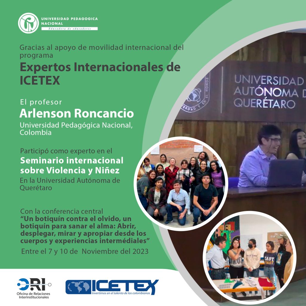 La Oficina de Relaciones Interinstitucionales de la Universidad Pedagógica Nacional (UPN) se complace en informar a la comunidad universitaria sobre el apoyo brindado por el Instituto Colombiano de Crédito Educativo y Estudios Técnicos en el Exterior, Mariano Ospina Pérez–ICETEX, a través del programa Expertos Internacionales. Este apoyo permitió la movilidad del profesor Arlenson Roncancio Ortiz de la Universidad Pedagógica Nacional (Colombia), quien hizo parte del «Seminario internacional sobre Violencia y Niñez», desarrollado entre el 7 al 10 de noviembre del 2023 en la ciudad de Querétaro – México.
