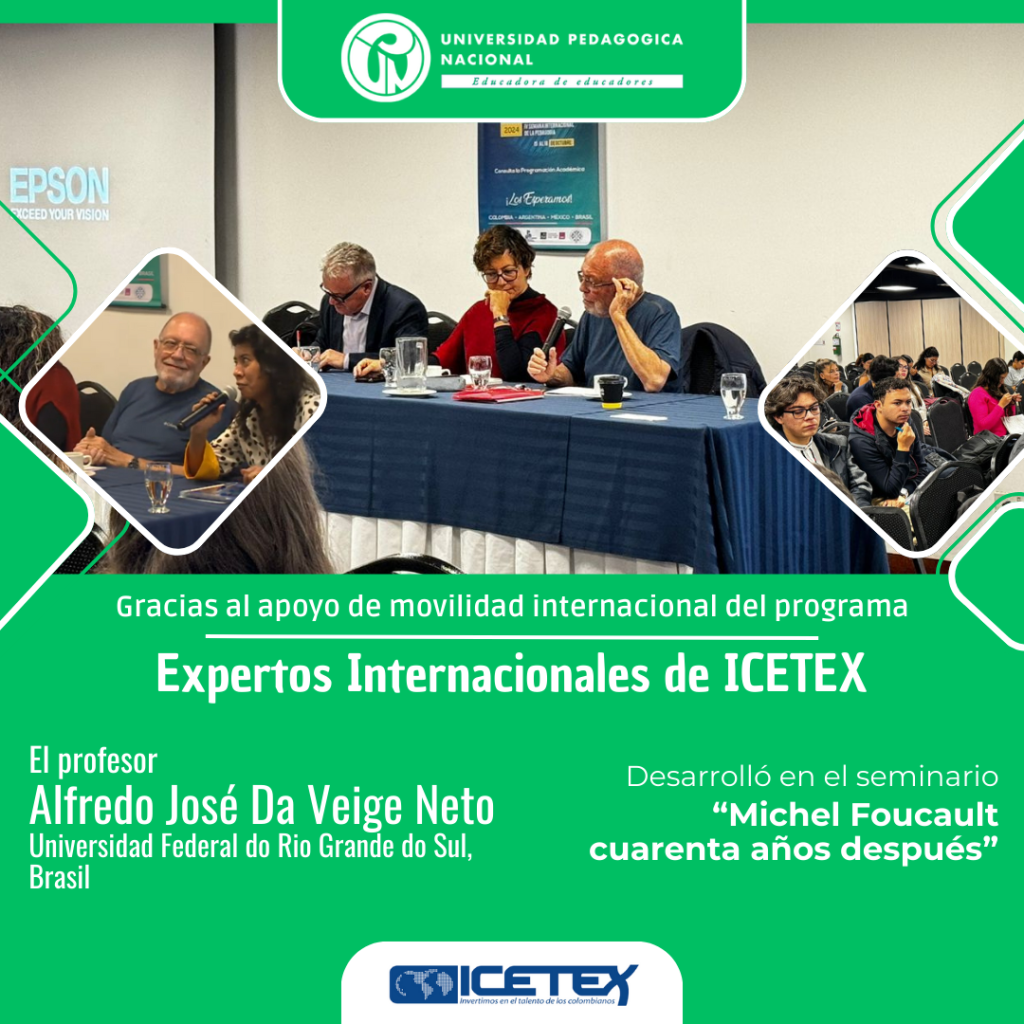 La Oficina de Relaciones Interinstitucionales de la Universidad Pedagógica Nacional (UPN) se complace en informar a la comunidad universitaria sobre el apoyo brindado por el Instituto Colombiano de Crédito Educativo y Estudios Técnicos en el Exterior, Mariano Ospina Pérez (ICETEX), a través del programa Expertos Internacionales. Gracias a este respaldo, se posibilitó la movilidad del Doctor Alfredo José Da Veiga Neto, distinguido académico de la Universidad Federal do Rio Grande do Sul, Brasil, quien participó en el «Seminario: “Michel Foucault cuarenta años después”», realizado del 11 al 19 de octubre de 2024.