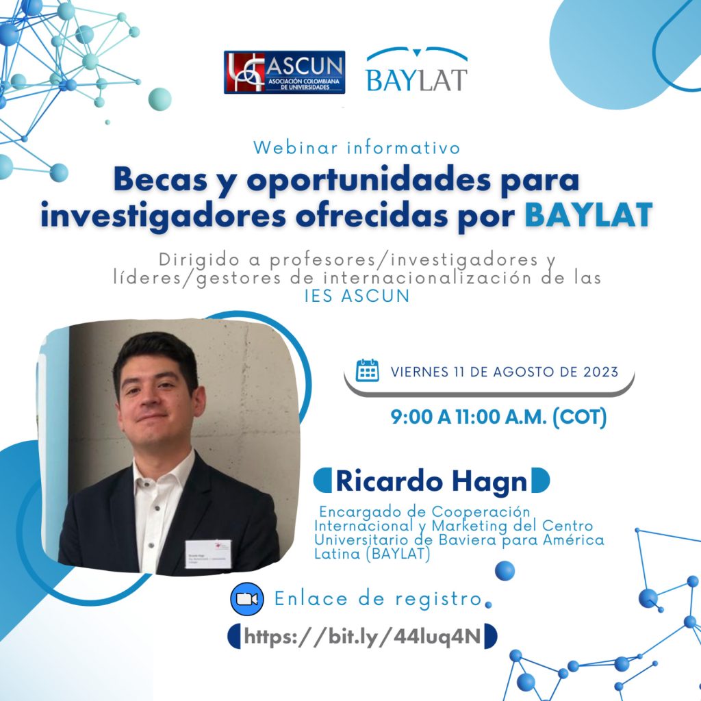 La Oficina de Relaciones Interinstitucionales invita a la comunidad universitaria a participar en el webinar informativo “Becas y oportunidades para investigadores ofrecidas por BAYLAT”, liderado por Ricardo Hagn, Encargado de Cooperación Internacional y Marketing de BAYLAT. En el marco de la reciente renovación de la Declaración conjunta de intenciones para la Cooperación Académica y Científica entre la Asociación Colombiana de Universidades (Ascun) y El Ministerio de Ciencias y Artes del Estado de Bavaria (STMWK), junto al Centro Universitario de Baviera para América Latina (BAYLAT).