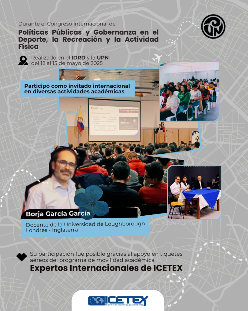 En el marco de las acciones de internacionalización académica de la Facultad de educación Física, el doctor Borja García desarrolló una agenda académica intensa en Congreso Internacional de Políticas Públicas y Gobernanza en el Deporte, la Recreación y la Actividad Física realizado del 12 al 15 de mayo de 2025. Su participación fue posible gracias al programa Expertos Internacionales de ICETEX.