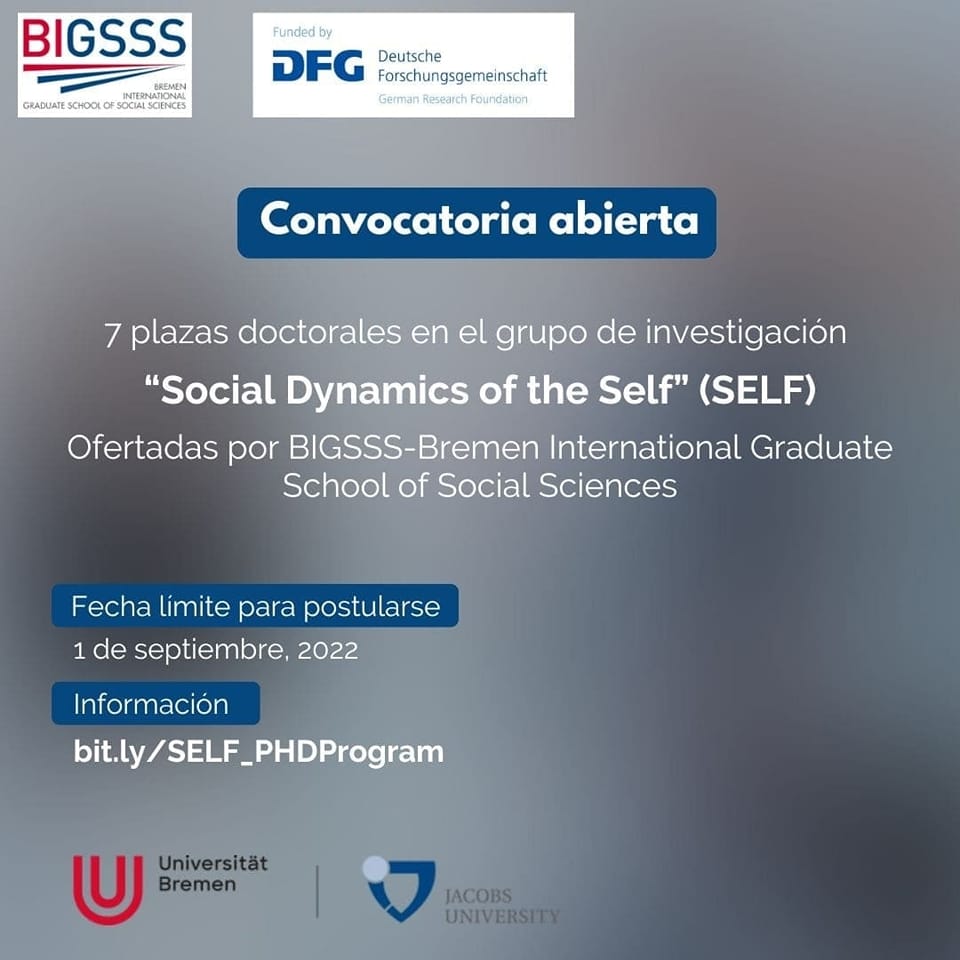 La oficina de relaciones Interinstitucionales informa a la comunidad académica la apertura del programa de BIGSSS-Bremen International Graduate School of Social Sciences. Esta convocatoria cuenta con financiación de la DFG (German Research Foundation) y ofrece 7 plazas doctorales en el grupo de investigación “Social Dynamics of the Self” (SELF).