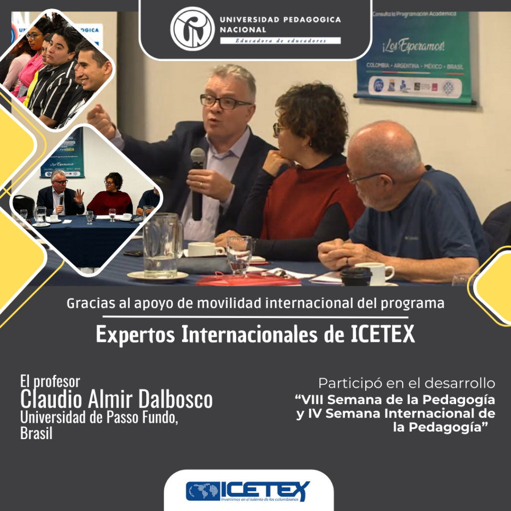 La Oficina de Relaciones Interinstitucionales de la Universidad Pedagógica Nacional (UPN) se complace en informar a la comunidad universitaria sobre el apoyo brindado por el Instituto Colombiano de Crédito Educativo y Estudios Técnicos en el Exterior, Mariano Ospina Pérez (ICETEX), a través del programa Expertos Internacionales. Este respaldo permitió la movilidad del profesor Claudio Almir Dalbosco, destacado académico de la Universidad de Passo Fundo, Brasil, quien participó en la «VIII Semana de la Pedagogía y IV Semana Internacional de la Pedagogía», celebrada del 14 al 20 de octubre de 2024.