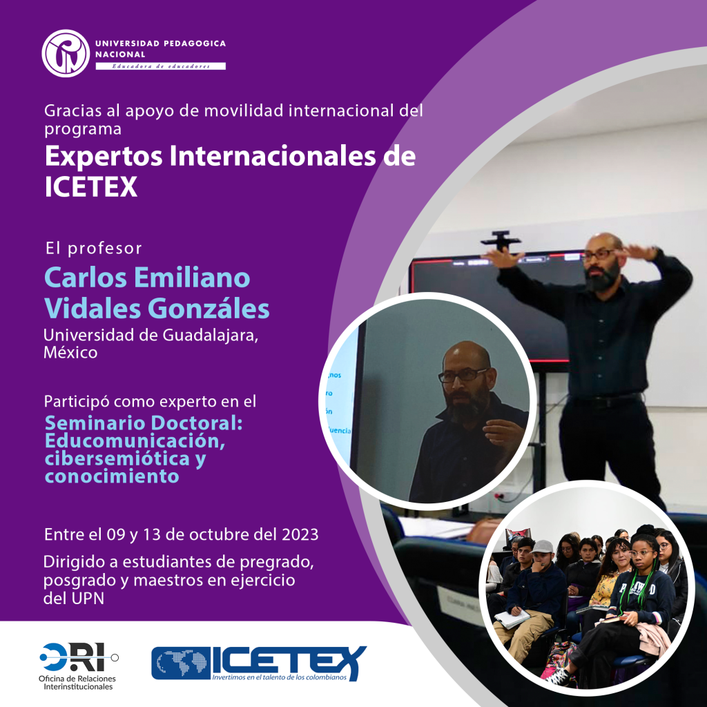 La Oficina de Relaciones Interinstitucionales de la Universidad Pedagógica Nacional (UPN) se complace en informar a la comunidad universitaria sobre el apoyo otorgado por el Instituto Colombiano de Crédito Educativo y Estudios Técnicos en el Exterior, Mariano Ospina Pérez–ICETEX, a través del programa de Expertos Internacionales. Este respaldo facilitó la movilidad del profesor Carlos Emiliano Vidales Gonzáles de la Universidad de Guadalajara (México), quien formó parte del «Seminario Doctoral: Educomunicación, cibersemiótica y conocimiento,» desarrollado del 09 al 13 de octubre de 2023.