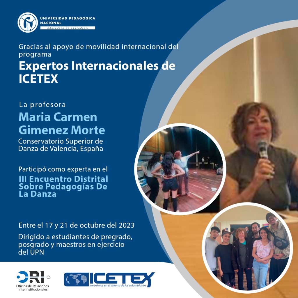 La Oficina de Relaciones Interinstitucionales de la Universidad Pedagógica Nacional (UPN) se complace en informar a la comunidad universitaria sobre el apoyo otorgado por el Instituto Colombiano de Crédito Educativo y Estudios Técnicos en el Exterior, Mariano Ospina Pérez–ICETEX, a través del programa de Expertos Internacionales. Este respaldo facilitó la movilidad de la profesora Carmen Gimenez del Conservatorio Superior de Danza de Valencia (España), quien formó parte del «III Encuentro Distrital Sobre Pedagogías De La Danza,» desarrollado del 16 al 22 de octubre de 2023.