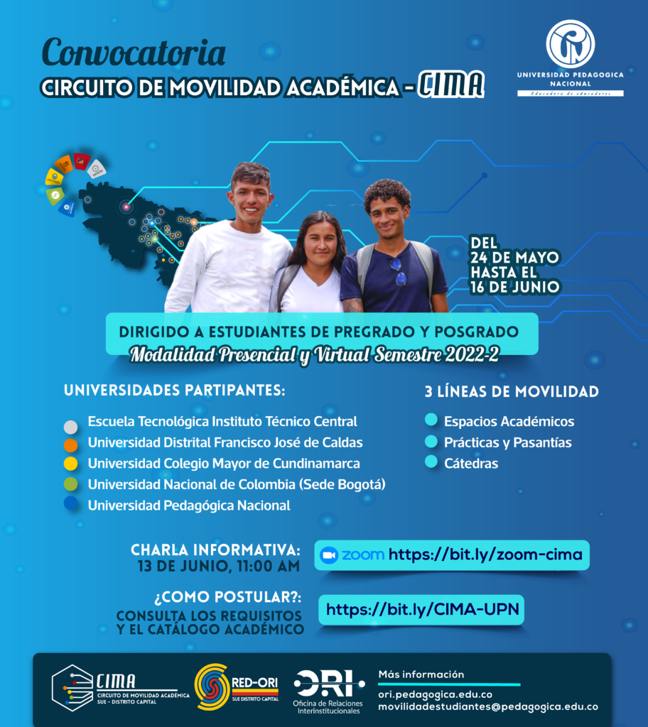 La Oficina de Relaciones Interinstitucionales de la Universidad Pedagógica Nacional de Colombia (ORI-UPN), invita a la comunidad universitaria a participar en la convocatoria del programa CIMA-Circuito de Movilidad Académica del SUE – Distrito Capital. Dirigida a estudiantes de pregrado y posgrado de la Universidad Colegio Mayor de Cundinamarca UNICOLMAYOR-, la Universidad Distrital Francisco José de Caldas -UDFJC-, la Escuela Tecnológica Instituto Técnico Central -ETITC-, la Universidad Nacional de Colombia – UNA sede Bogotá- y la Universidad Pedagógica Nacional UPN.