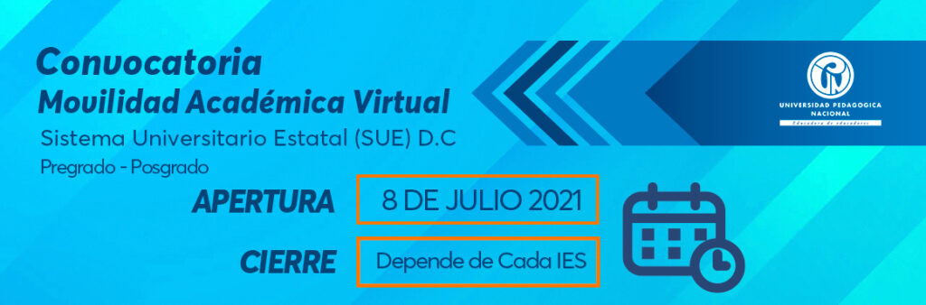 La Oficina de Relaciones Interinstitucionales de la Universidad Pedagógica Nacional de Colombia (ORI-UPN), se complace en abrir la Convocatoria de Movilidad Académica Estudiantil para el periodo 2021 -2 modalidad virtual en Sistema Universitario Estatal –SUE- específicamente en la Universidad Nacional, Universidad Distrital Francisco José de Caldas, Escuela Tecnológica Instituto Técnico Central y Universidad Colegio Mayor de Cundinamarca.