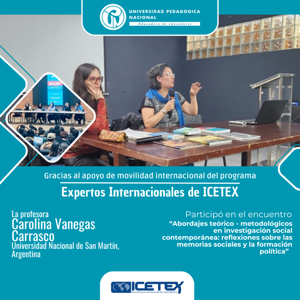 La Oficina de Relaciones Interinstitucionales de la Universidad Pedagógica Nacional (UPN) se complace en informar a la comunidad universitaria sobre el apoyo brindado por el Instituto Colombiano de Crédito Educativo y Estudios Técnicos en el Exterior, Mariano Ospina Pérez–ICETEX, a través del programa Expertos Internacionales. Este apoyo permitió la movilidad de la profesora Carolina Vanegas Carrasco, invitada internacional de la Universidad Nacional de San Martín, Argentina, quien participó en el «Encuentro abordajes teórico – metodológicos en investigación social contemporánea: reflexiones sobre las memorias sociales y la formación política» del 26 al 30 de agosto del 2024.