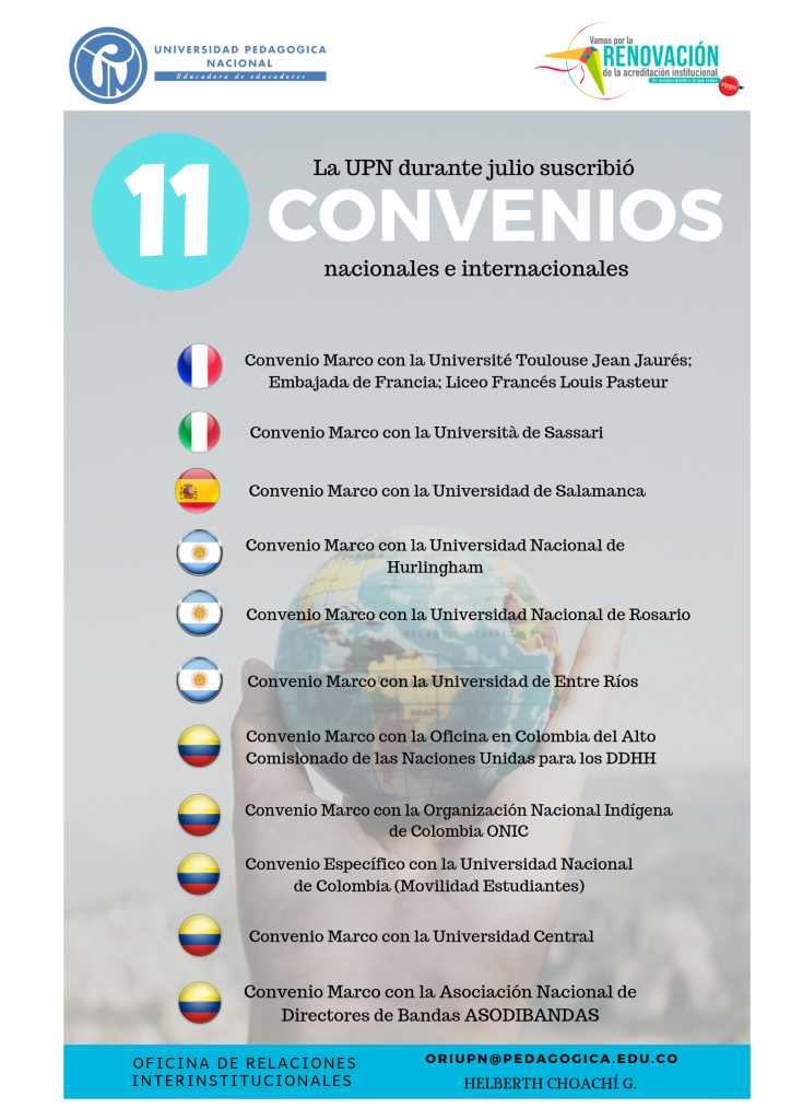 signed 11 agreements with national and international institutions. These agreements aim at continuing the construction of spaces for cooperation where we can participate and foster our mission under a perspective of Human Rights, support for indigenous populations, arts and culture in Europe, Latin America and Colombia, which helps to construct a GLOCALIZED UPN.