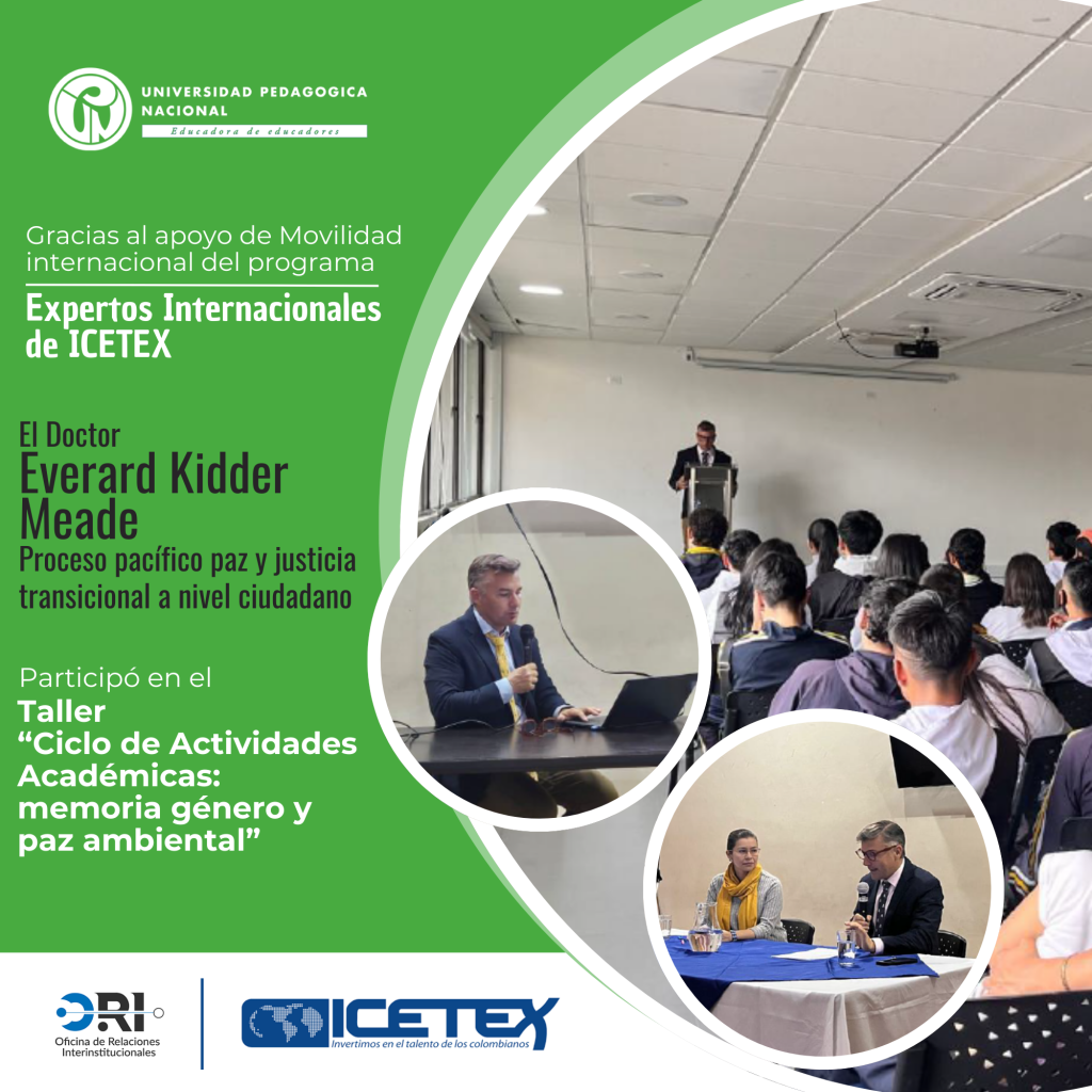 La Oficina de Relaciones Interinstitucionales de la Universidad Pedagógica Nacional (UPN) se complace en informar a la comunidad universitaria sobre el apoyo brindado por el Instituto Colombiano de Crédito Educativo y Estudios Técnicos en el Exterior, Mariano Ospina Pérez–ICETEX, a través del programa Expertos Internacionales. Este apoyo permitió la movilidad del Doctor Everard Kidder Meade del Proceso Pacífico Paz y Justicia Transicional a Nivel Ciudadano, quien participó en diferentes talleres y conferencias del «Ciclo de Actividades Académicas: Memoria, Género y Paz Ambiental» durante su estancia entre el 20 y el 27 de mayo de 2024.