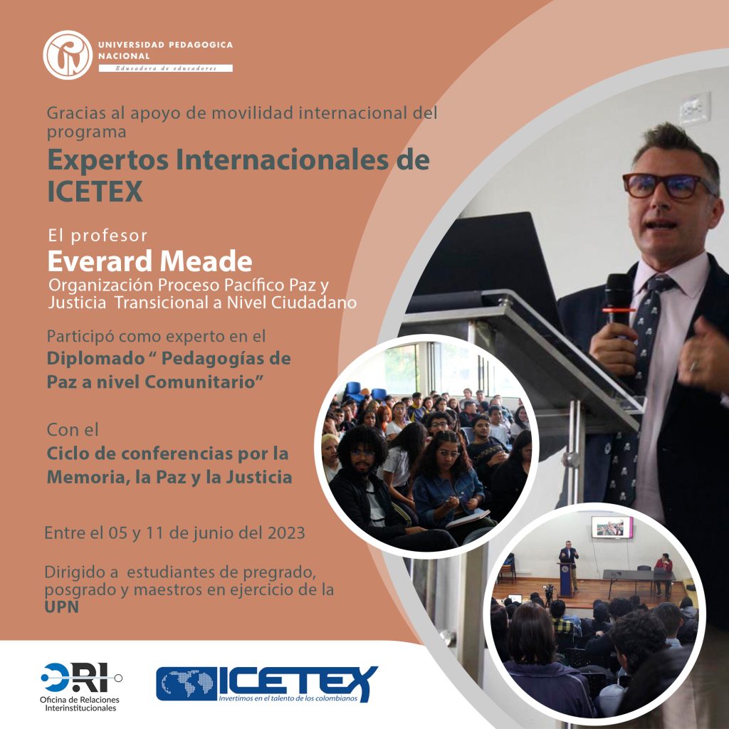 La Oficina de Relaciones Interinstitucionales de la Universidad Pedagógica Nacional (UPN) informa a la comunidad universitaria que el Instituto Colombiano de Crédito Educativo y Estudios Técnicos en el Exterior, Mariano Ospina Pérez–ICETEX, a través del programa Expertos Internacionales, apoyó la movilidad de la profesor Everard Meade.