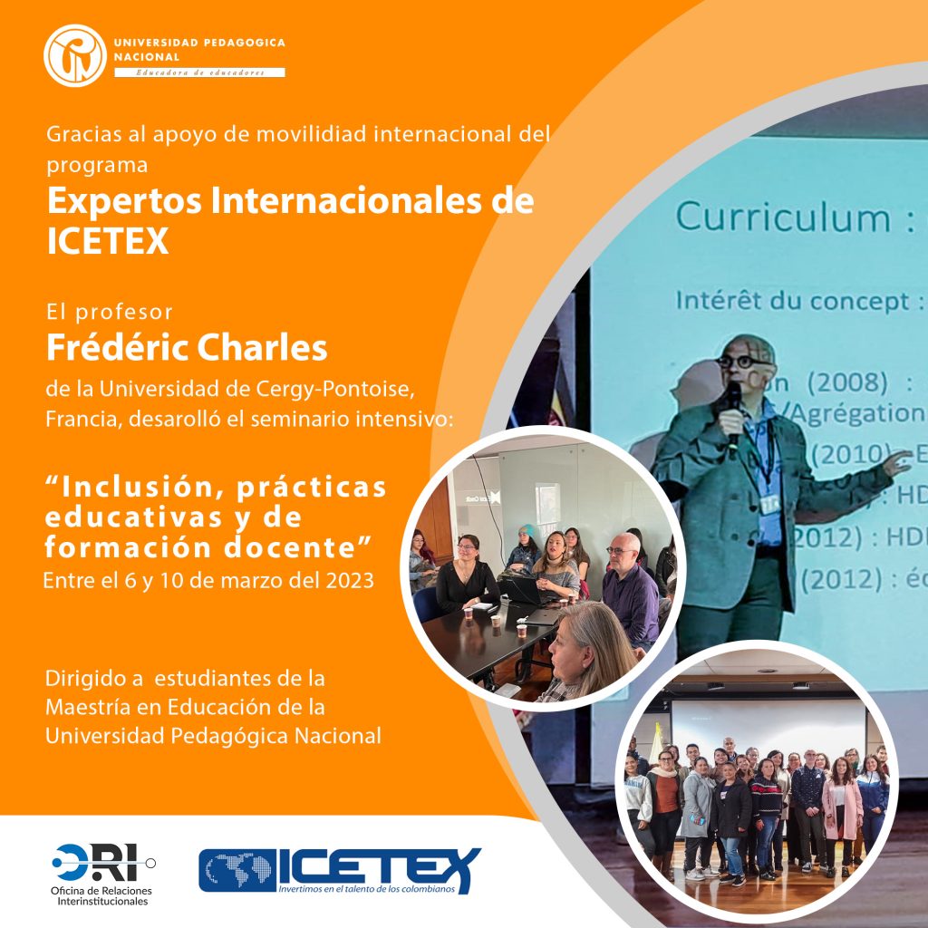 Bogotá, D.C. – La Oficina de Relaciones Interinstitucionales de la Universidad Pedagógica Nacional (UPN) informa a la comunidad universitaria que el Instituto Colombiano de Crédito Educativo y Estudios Técnicos en el Exterior, Mariano Ospina Pérez–ICETEX, a través del programa Expertos Internacionales, apoyó la movilidad del profesor Frédéric Charles de la Universidad de Cergy-Pontoise, Francia, para realizar el seminario titulado: “Inclusión, prácticas educativas y de formación docente”, desarrollado entre el 6 y el 10 de marzo del 2023. Esta propuesta se enmarca en un proyecto interuniversitario de universidades europeas y americanas que adelanta PREFALC (organización europea).