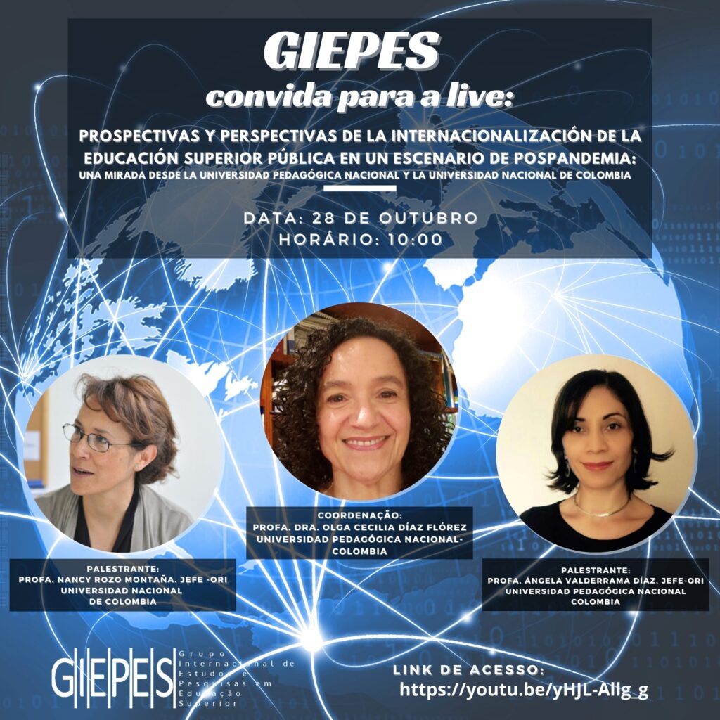 La oficina de Relaciones interinstitucionales-ORI y el Grupo Internacional de Estudos e Pesquisa sobre Educação Superior- GIEPES da Faculdade de Educação-Unicamp, Brasil, invitan a la comunidad académica a participar en el evento Prospectivas y perspectivas de la internacionalización de la Educación superior pública en un escenario de pospandemia : Una mirada desde la Universidad pedagógica nacional y la universidad nacional de Colombia.