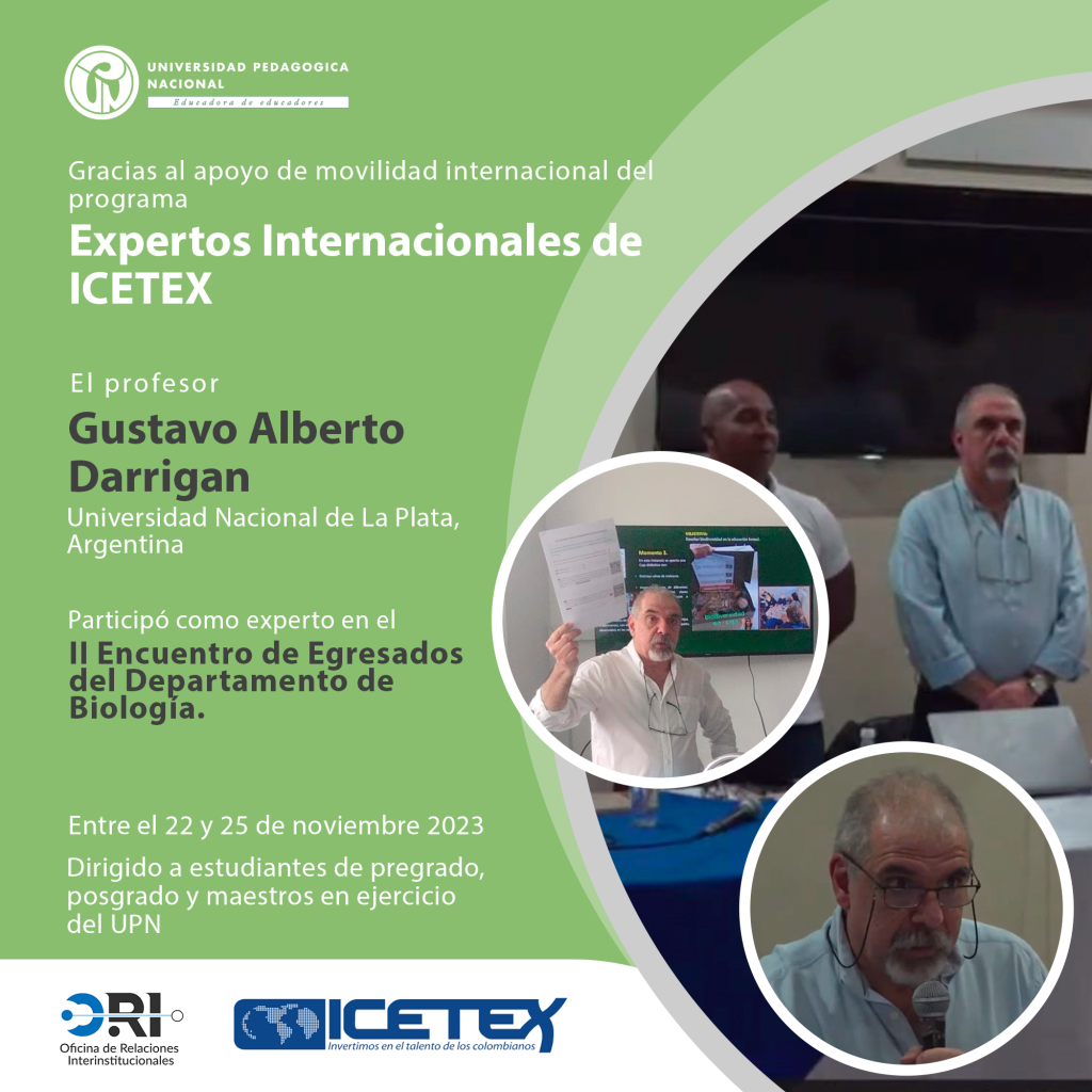 La Oficina de Relaciones Interinstitucionales de la Universidad Pedagógica Nacional (UPN) se complace en informar a la comunidad universitaria sobre el apoyo otorgado por el Instituto Colombiano de Crédito Educativo y Estudios Técnicos en el Exterior, Mariano Ospina Pérez–ICETEX, a través del programa de Expertos Internacionales. Este respaldo facilitó la movilidad del profesor Gustavo Alberto Darrigran del Museo de La Plata, FCNyM, Sección Malacología, Facultad de Humanidades y Ciencias de la Educación (UNLP). Departamento de Ciencias Exactas y Naturales (Argentina), quien formó parte del «II Encuentro de Egresados del Departamento de Biología,» desarrollado del 20 al 26 de noviembre de 2023.