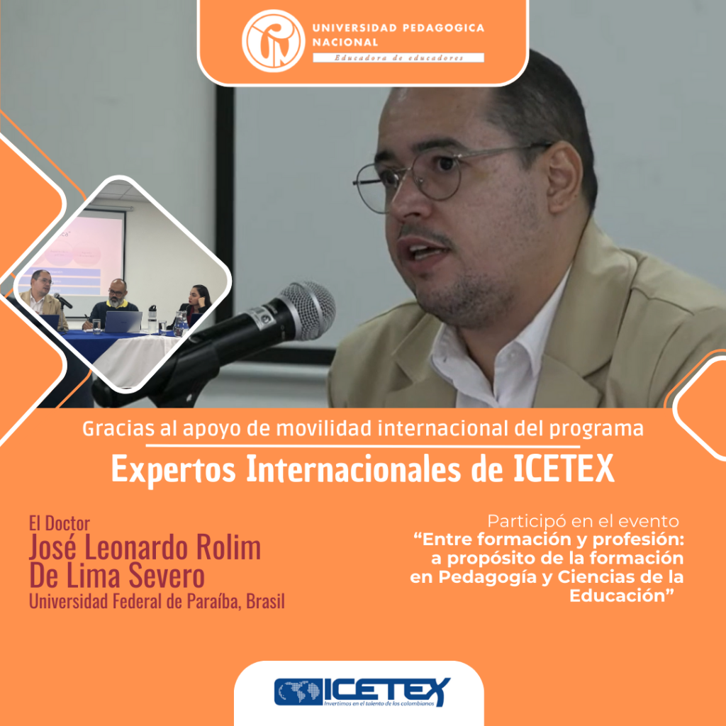 La Oficina de Relaciones Interinstitucionales de la Universidad Pedagógica Nacional (UPN) se complace en informar a la comunidad universitaria sobre el apoyo brindado por el Instituto Colombiano de Crédito Educativo y Estudios Técnicos en el Exterior, Mariano Ospina Pérez (ICETEX), a través del programa Expertos Internacionales. Este respaldo permitió la movilidad del Doctor José Leonardo Rolim De Lima Severo, destacado académico de la Universidad Federal de Paraíba, Brasil, quien participó en el evento «Entre formación y profesión: a propósito de la formación en Pedagogía y Ciencias de la Educación», realizado del 9 al 15 de junio de 2024.