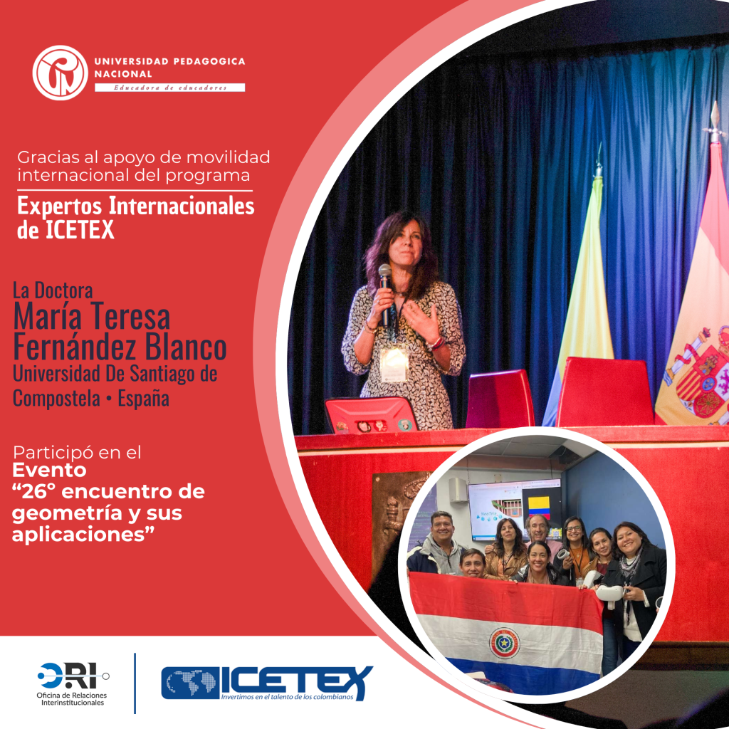 La Oficina de Relaciones Interinstitucionales de la Universidad Pedagógica Nacional (UPN) se complace en informar a la comunidad universitaria sobre el apoyo brindado por el Instituto Colombiano de Crédito Educativo y Estudios Técnicos en el Exterior, Mariano Ospina Pérez–ICETEX, a través del programa Expertos Internacionales. Este apoyo permitió la movilidad de la Doctora María Teresa Fernández Blanco de la Universidad de Santiago de Compostela (España), quien participó en el evento «26.° Encuentro de Geometría y sus Aplicaciones» durante su estancia entre el 17 y el 22 de junio de 2024.