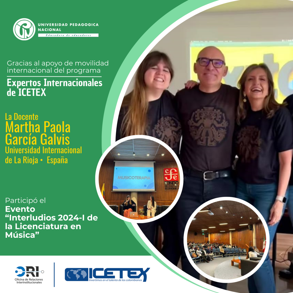 La Oficina de Relaciones Interinstitucionales de la Universidad Pedagógica Nacional (UPN) se complace en informar a la comunidad universitaria sobre el apoyo brindado por el Instituto Colombiano de Crédito Educativo y Estudios Técnicos en el Exterior, Mariano Ospina Pérez–ICETEX, a través del programa Expertos Internacionales. Este apoyo permitió la movilidad de la profesora Martha Paola García Galvis de la Universidad Internacional de la Rioja (España), quien participó en el evento «Interludios 2024-I de la Licenciatura en Música.» entre el 06 y el 12 de mayo de 2024.