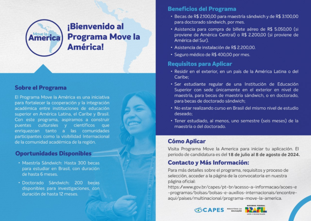 - Proceso de inscripción: Todo el proceso es gratuito y online. Se recomienda revisar el texto de la convocatoria y el calendario del proceso selectivo en: https://www.gov.br/capes/pt-br/acesso-a-informacao/acoes-e-programas/bolsas/bolsas-e-auxilios-internacionais/encontre-aqui/paises/multinacional/programa-move-la-america.