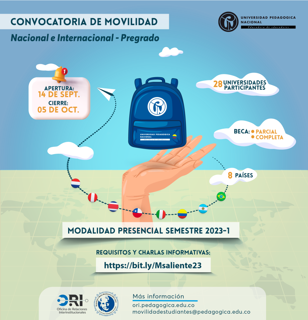 La Oficina de Relaciones Interinstitucionales -ORI- de la Universidad Pedagógica Nacional de Colombia -UPN-, se complace en abrir la Convocatoria de Movilidad Académica Estudiantil Presencial para el primer semestre de 2023. A través de esta, la UPN ofrece a los estudiantes de pregrado interesados, dos modalidades de Beca que constituyen un beneficio institucional otorgado para cursar un semestre académico en una Institución de Educación Superior (IES) en Colombia y/o en el exterior.
