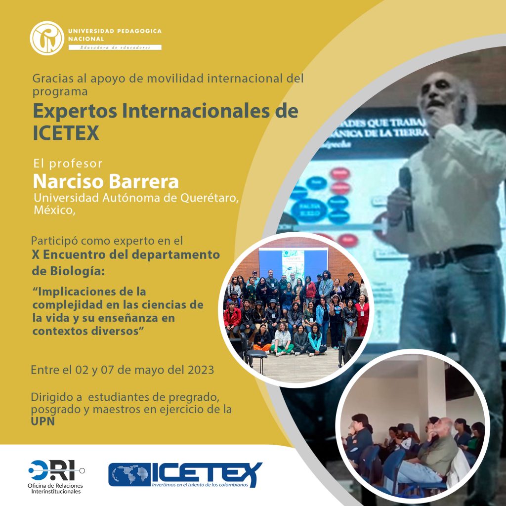 La Oficina de Relaciones Interinstitucionales de la Universidad Pedagógica Nacional (UPN) informa a la comunidad universitaria que el Instituto Colombiano de Crédito Educativo y Estudios Técnicos en el Exterior, Mariano Ospina Pérez–ICETEX, a través del programa Expertos Internacionales, apoyó la movilidad del profesor Narciso Barrera Bassols de la Universidad Autónoma de Querétaro, México, para realizar el simposio titulado: “X Encuentro del Departamento de Biología: Implicaciones de la Complejidad en las ciencias de la Vida y su enseñanza en contextos diversos”, desarrollado entre el 02 y 07 de mayo de 2023. Se enmarca la importancia del evento en torno a los temas de mayor relevancia alrededor de la biología que se ha organizado desde el departamento de Biología de la Universidad Pedagógica Nacional