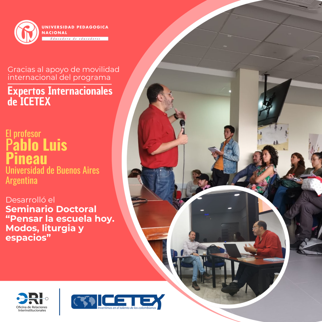 La Oficina de Relaciones Interinstitucionales de la Universidad Pedagógica Nacional (UPN) se complace en informar a la comunidad universitaria sobre el apoyo brindado por el Instituto Colombiano de Crédito Educativo y Estudios Técnicos en el Exterior, Mariano Ospina Pérez–ICETEX, a través del programa Expertos Internacionales. Este apoyo permitió la movilidad del profesor Pablo Luis Pineau de la Universidad de Buenos Aires (Argentina), quien participó en diferentes actividades; durante su estancia entre el 23 de febrero y 02 de marzo de 2024, entre ellas el «Seminario Doctoral “Pensar la escuela hoy. Modos, liturgias y espacios”».
