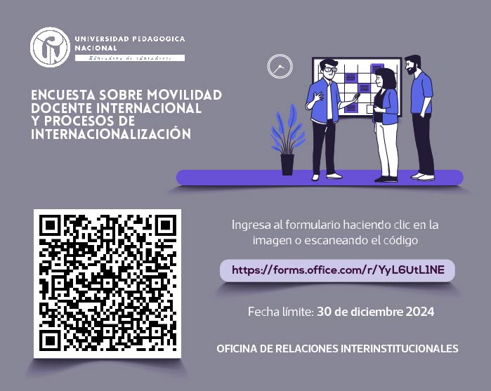 La Oficina de Relaciones Interinstitucionales (ORI) invita a todos los docentes de la Universidad Pedagógica Nacional a responder la Encuesta sobre Movilidad Docente Internacional y Procesos de Internacionalización. El objetivo es identificar las experiencias de movilidad académica, conocer las necesidades y sugerencias que permitan fortalecer los procesos de internacionalización de la universidad.