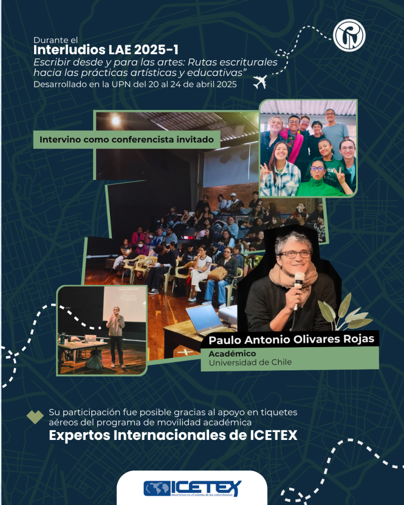 El profesor Paulo Antonio Olivares Rojas, académico de la Universidad de Chile, fue uno de los invitados internacionales a los Interludios LAE 2025-1: Escribir desde y para las artes, una propuesta formativa de la Licenciatura en Artes Escénicas de la Universidad Pedagógica Nacional, que tuvo lugar entre el 21 y el 25 de abril de 2025. Durante su visita, Olivares desarrolló talleres, conferencias, clases magistrales y jornadas de trabajo con semilleros, abordando las relaciones entre escritura, cuerpo, pedagogía y creación en las artes escénicas.