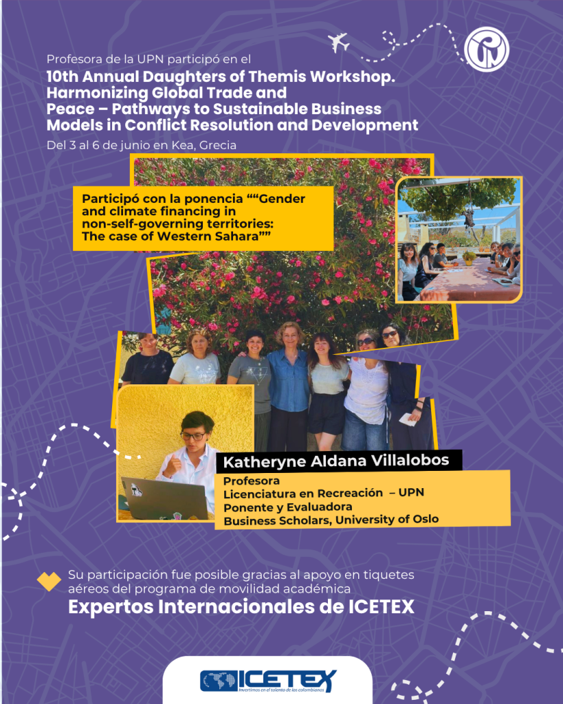 En el marco de las acciones de internacionalización de la Facultad de Educación Física, la profesora Katheryne Aldana Villalobos, docente del programa de Licenciatura en Recreación, participó como ponente en el 10th Annual Daughters of Themis Workshop: Harmonizing Global Trade and Peace – Pathways to Sustainable Business Models in Conflict Resolution and Development, realizado del 3 al 6 de junio de 2025 en Kea, Grecia.