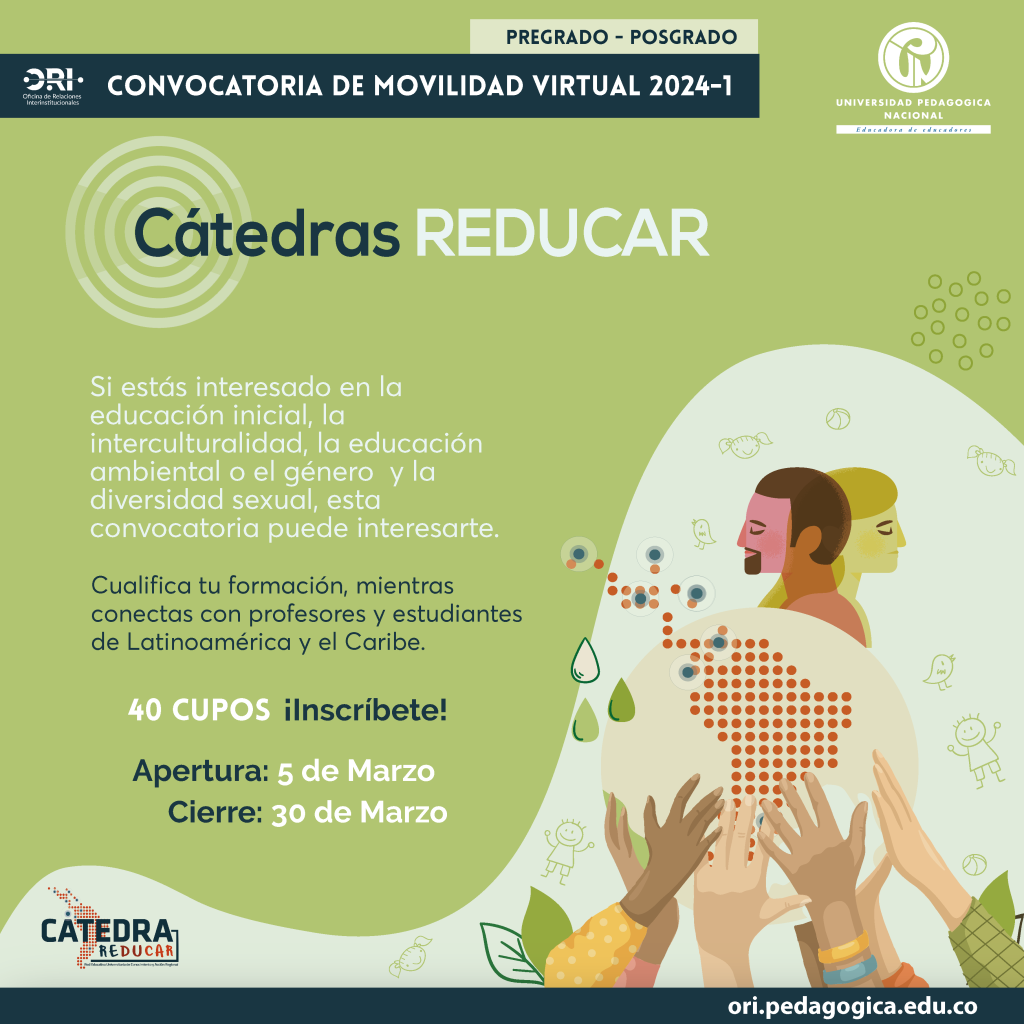 La UPN (Colombia), el ISFODOSU (República Dominicana), la UNIPE (Argentina), la UPN (México), la UNAE (Ecuador), la UPNFM (Honduras) y la UP (Bolivia)- instituciones miembros de la Red Educativa Universitaria de Conocimiento y Acción Regional (REDUCAR)- los invitan a participar de las CÁTEDRAS que se desarrollarán del 15 al 26 de abril de 2024.