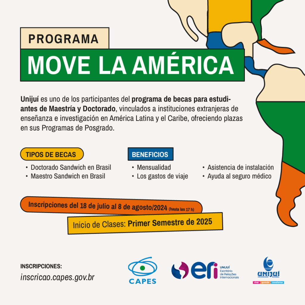 La Oficina de Relaciones Interinstitucionales (ORI) invita a los estudiantes de posgrado y profesores a participar en la convocatoria de plazas gratuitas para programas de Máster y Doctorado Sándwich en la Universidade Regional do Noroeste do Estado do Rio Grande do Sul (UNIJUÍ), ubicada en Rio Grande do Sul, Brasil. Esta oportunidad forma parte del Programa Move La América, una iniciativa de la Fundação Coordenação de Aperfeiçoamento de Pessoal de Nível Superior (CAPES).