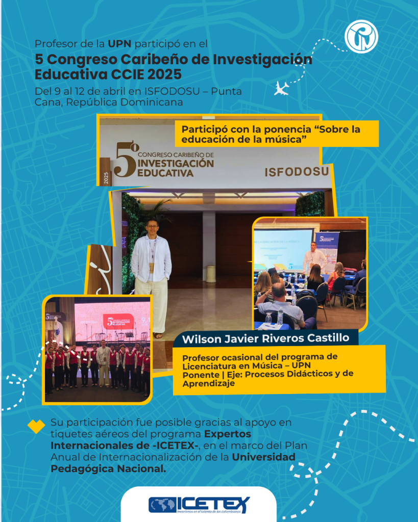Como parte de la estrategia de internacionalización de la Universidad Pedagógica Nacional, el profesor Wilson Javier Riveros Castillo, adscrito al Departamento de Artes y docente de la Licenciatura en Música, participó en el 5.º Congreso Caribeño de Investigación Educativa, organizado por el Instituto Superior de Formación Docente Salomé Ureña (ISFODOSU) en Punta Cana, República Dominicana, del 9 al 12 de abril de 2025. Su ponencia titulada “Sobre la educación de la música” fue presentada en el eje temático “Procesos didácticos y de aprendizaje”, representando a Colombia y a la UPN ante una audiencia internacional.