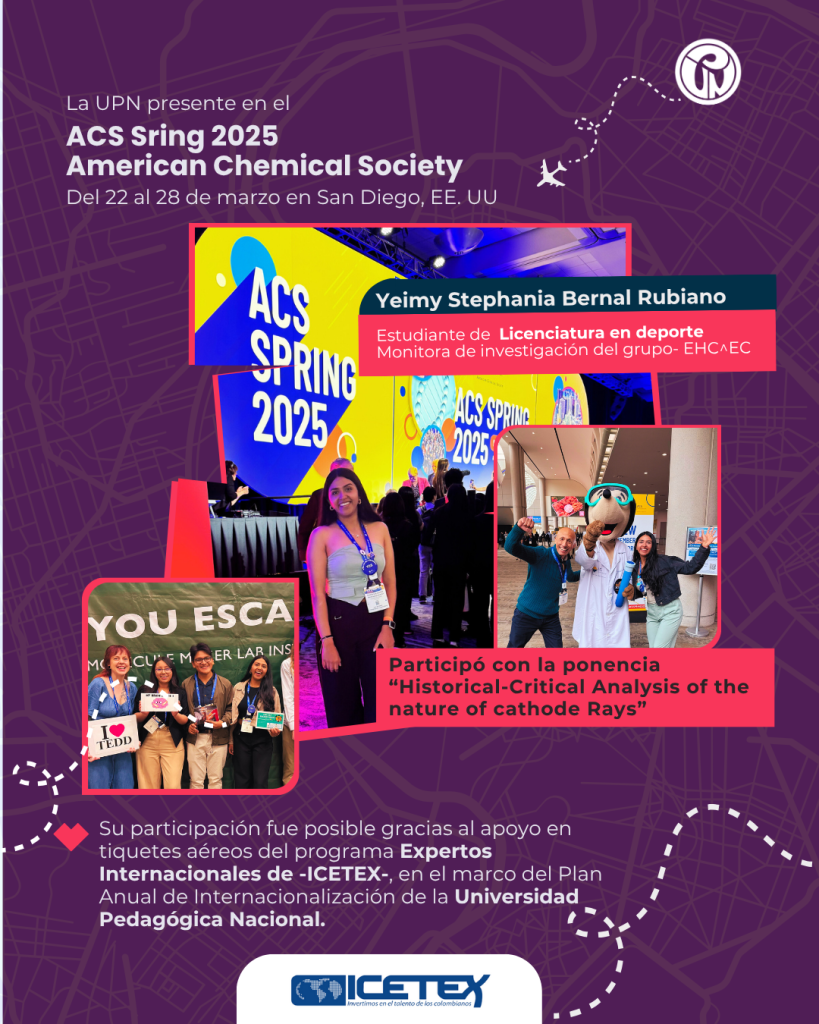 Yeimy Stephania Bernal Rubiano, estudiante de décimo semestre de la Licenciatura en Química de la Facultad de Ciencia y Tecnología de la Universidad Pedagógica Nacional, participó como ponente en el evento internacional ACS Spring 2025, celebrado del 23 al 26 de marzo en San Diego, California. Su presentación se centró en el rol del capítulo estudiantil de la ACS en el desarrollo de habilidades investigativas, destacando su formación como futura docente de ciencias.